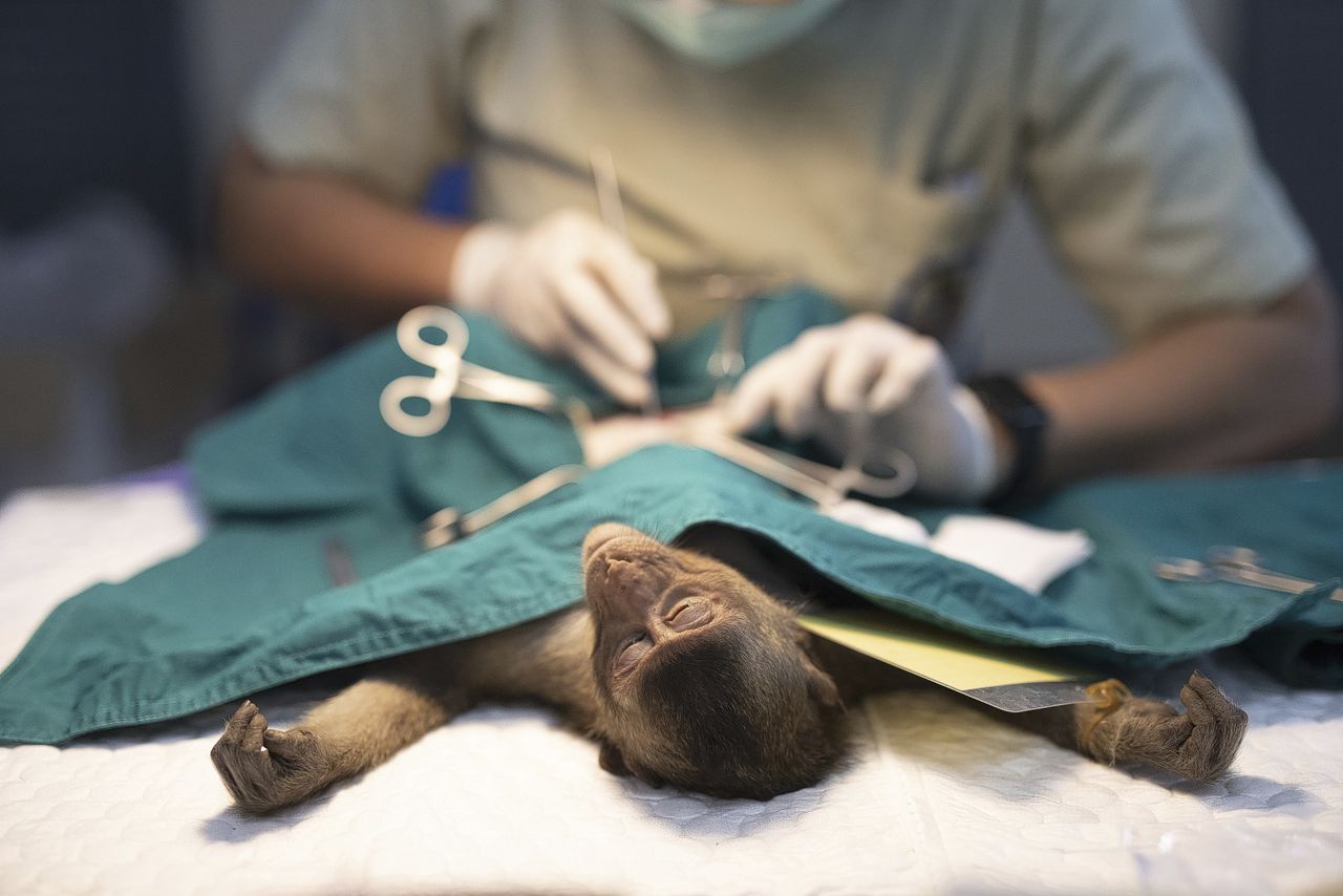 Foto Chalinee Thirasupa / ReutersHier wordt een makaak door een Thaise dierenarts gesteriliseerd.Foto Rungroj Yongrit / EPADit zijn wel dieren, maar het zijn geen panda’s. Het zijn honden in een Chinese dierentuin in de provincie Hubei, gefotografeerd in november. De dierentuin heeft wel een bordje bij het verblijf gehangen waarop staat dat de panda’s nep zijn. Eerder dit jaar kwam een andere Chinese dierentuin in opspraak, ook daar werden honden gepresenteerd als panda’s. Na veel kritiek gaf die dierentuin, in de provincie Guangdong, toe zijn bezoekers te misleiden en honden geverfd te hebben.Foto Costfoto/NurPhoto/Getty ImagesJonge Kenianen met een jonge giraffe, in juli. De giraffe is net met soortgenoten aangekomen in een natuurpark in het westen van Kenia.Foto Luis Tato / AFP